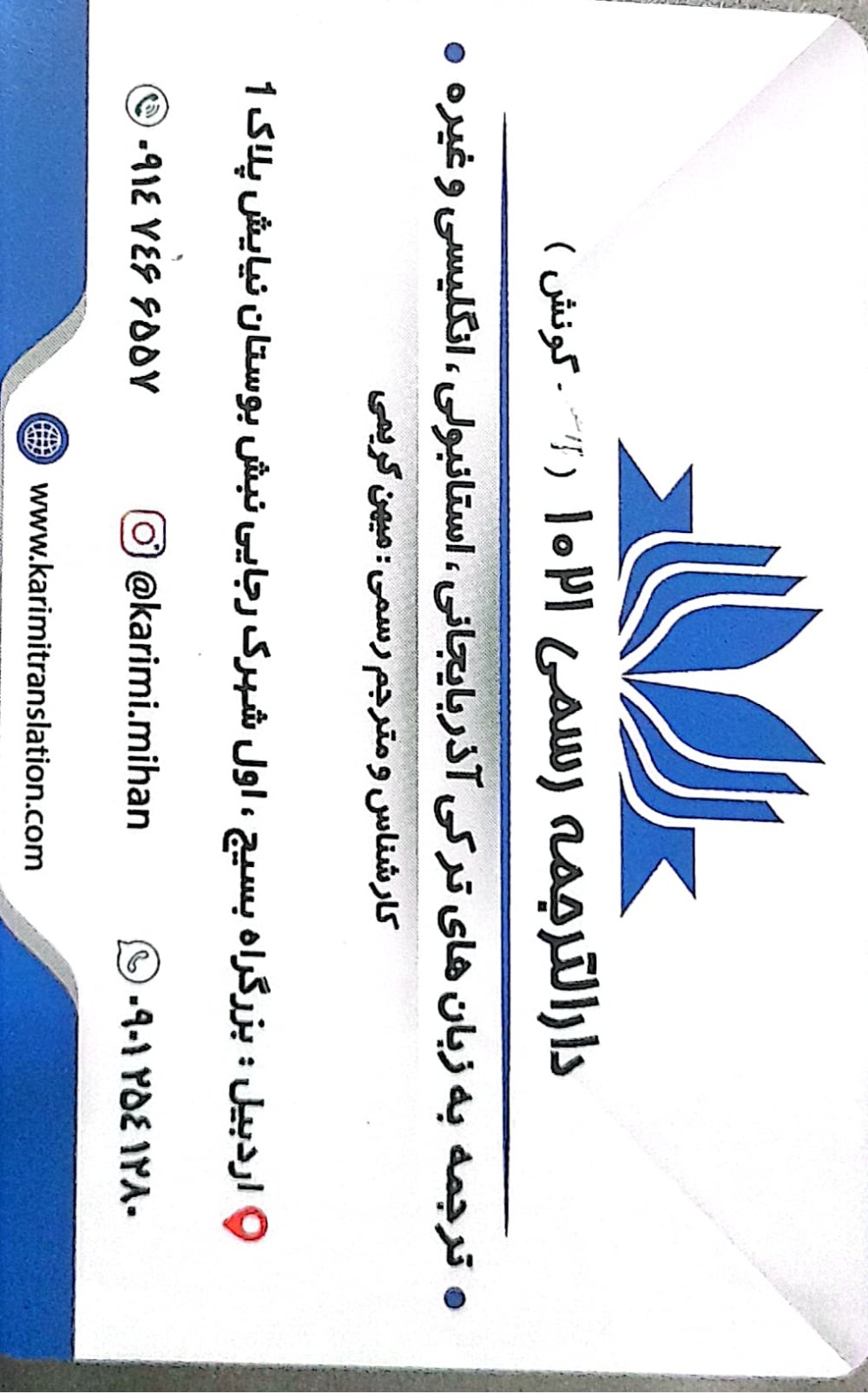 دارالترجمه رسمی 1021 با توجه به اینکه استان اردبیل هم مرز با جمهوری آذربایجان می باشد و با در نظر گرفتن مراجعین محترم از قبیل تجار، کارفرما، سرمایه گذار، بیماران و.... به استان و کشورمان، جهت تسهیل کار و ترجمه اسناد رسمی و غیر رسمی این عزیزان در رابطه با زبان مبدا و مقصد آماده همکاری است و همچنین در راستای اهداف مراجعین محترم با ادارات مربوطه، کارخانه ها، بیمارستانها و غیره همگام و همراه با مشتریان خود می باشد. دارالترجمه رسمی 1021علاوه بر ترجمه رسمی زبان ترکی آذربایجانی در ترجمه رسمی و غیر رسمی زبانهای دیگر از جمله زبان انگلیسی، استانبولی و ... در خدمت مراجعین محترم می باشد و بدون اتلاف وقت ارائه خدمت می کند. دارالترجمه رسمی 1021 اولین دارالترجمه رسمی است که در شهر اردبیل واقع شده است شما میتوانید از طریق پست ، تلفن ، ایمیل، واتساپ و یا به طور حضوری با ما ارتباط برقرار کنید. ارایه خدمت به شما باعث خرسندی ما خواهد شد. هزینه ترجمه ها بر اساس نرخنامه مصوب اداره امور مترجمین رسمی کشور محاسبه می شود. مترجم و مسئول دارلترجمه 1021 (میهن کریمی سامیان)
